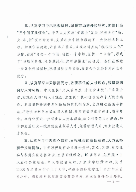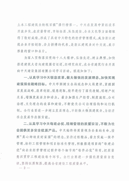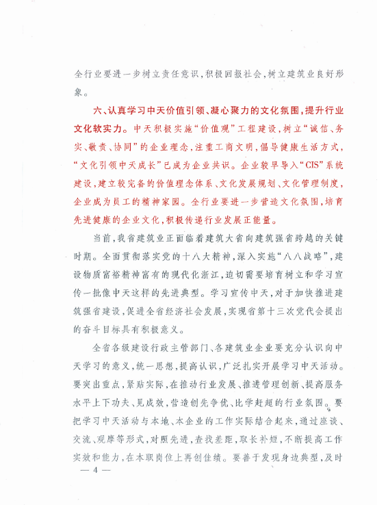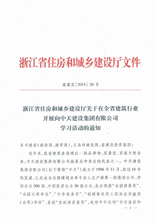 《浙江省住房和城鄉建設廳關于在全省建筑行業開展向中天建設集團有限公司學習活動的通知》